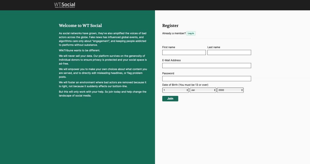 ,并声称与标题党和误导性内容对立。WT:Social 网站主页十分简练,全体色彩以绿色和黑色为主,在主页的介绍中,这家网站也开门见山地提出现有交际网络中假新闻众多的问题,并许诺永久不会出售用户的数据。